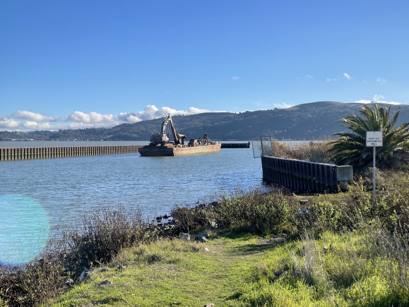 life, art, touring…and dogs with Bonnie. A good time was had by all but the long evening led to long sleeping, a condensed Monday wherein L. went to Kaiser for those shots only to find their shooting gallery closed for lunch so came home for ours, somewhat rushed as I’d agreed to let the Benicia Community Foundation bring half dozen people involved in making a movie about the barge fight for a look at the murals at 1:30 but, classic incrementalism, the guy wanted to come “7 – 10 minutes early” though when L and I went out to look at the Mini at 1:10 he was there already with the news that the half dozen people were now eight or ten…I tried to figure out the nonfunctional latch before the crowd, more like a dozen including the mayor and some seemingly random high school student, trickled in for a tour I hadn’t anticipated giving but, oh well; I talked about what I knew and with the 6’4″ trans screenwriter while the rest of them took to seemingly endlessly shmoozing* in the Jack Room. They’d made a good little film on Captain Jack and the Modoc War which boded well if they ever got the Barge Fight afloat [though David had indicated it was all underway with a huge soundstage lined up in Marin in fact so far all that existed was the script]. Once things cleared out I looked up the the Mini latch,
